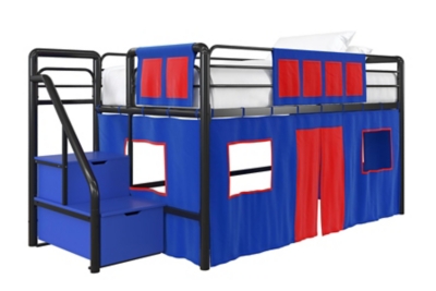 Kids Junior Twin Loft Bed With Storage Steps And Blue House Curtain Set Ashley